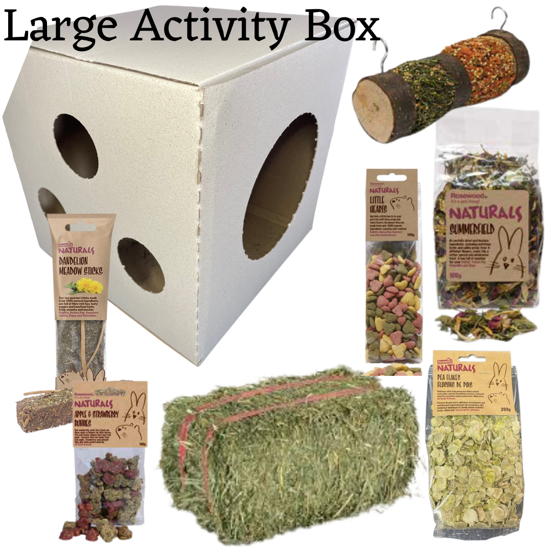 New and Updated Activity Box - Fill the box with hay and treats for hours of fun for your furry friends. With cutouts they can climb inside or enjoy from the outside!