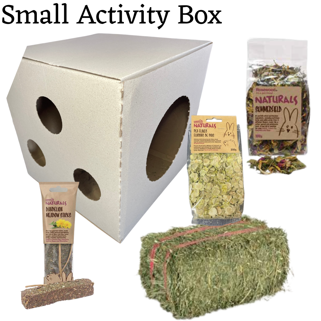 Build your unique activity Box- Simply build your box, place box in your critters cage, fluff up the hay inside, sprinkle Summerfield and treats in the hay, hang or place toys inside and let your furry friend enjoy!!